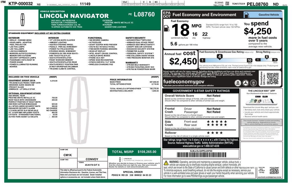 Equipment Group 201A Reserve I, Luxury Package (Illuminated 1st & 2nd Row Seat Belts, Lincoln Lit Star in Grille, Perfect Position Seats (30-Way) w/Active Motion, and Radio: Revel Ultima 3D Audio System w/28 Speakers), Auto High-beam Headlights, Delay-off headlights, Front fog lights, Fully automatic headlights, 14 Speakers, 2nd Row Htd/Vent Enhcd Massage Seats w/out Console, 3.73 Axle Ratio, 3rd row seats: split-bench, 4-Wheel Disc Brakes, ABS brakes, Active Park Assist 2.0 Delete, Adaptive suspension, Adjustable pedals, Air Conditioning, All-Weather Floor Liners w/Carpet Floor Mats, Alloy wheels, AM/FM radio: SiriusXM with 360L, Audio memory, Auto Start-Stop Technology, Auto tilt-away steering wheel, Auto-dimming door mirrors, Auto-dimming Rear-View mirror, Auto-leveling suspension, Automatic temperature control, Bodyside moldings, Brake assist, Bumpers: body-color, Chrome Roof Rack w/Black Crossbars, Compass, Cruise Control / Speed control, Driver door bin, Driver vanity mirror, Driver's Seat Mounted Armrest, Dual front impact airbags, Dual front side impact airbags, Electronic Stability Control, Emergency communication system: 911 Assist, Exterior Parking Camera Rear, Four wheel independent suspension, Front anti-roll bar, Front Bucket Seats, Front dual zone A/C, Front reading lights, Garage door transmitter, Genuine wood dashboard insert, Genuine wood door panel insert, Hands-Free Liftgate Delete, Head restraints memory, Heads-Up Display, Heated door mirrors, Heated front seats, Heated rear seats, Heated steering wheel, HVAC memory, Illuminated entry, Leather steering wheel, Low tire pressure warning, Memory seat, Navigation system: Connected Navigation (3-year trial), Occupant sensing airbag, Outside temperature display, Overhead airbag, Overhead console, Panic alarm, Passenger door bin, Passenger seat mounted armrest, Passenger vanity mirror, Pedal memory, Power adjustable rear head restraints, Power door mirrors, Power driver seat, Power Liftgate, Power moonroof: Panoramic Vista Roof, Power passenger seat, Power steering, Power windows, Prem Lthr Auto Htd/Ventiltd Perfect Position Seats, Radio data system, Radio: Revel AM/FM/HD/MP3 Audio System, Rain sensing wipers, Rear air conditioning, Rear anti-roll bar, Rear audio controls, Rear reading lights, Rear window defroster, Rear window wiper, Reclining 3rd row seat, Remote keyless entry, Security System, SiriusXM w/360L, Speed-sensing steering, Speed-Sensitive Wipers, Split folding rear seat, Spoiler, Steering wheel memory, Steering wheel mounted audio controls, SYNC 4 Communications & Entertainment System, Tachometer, Telescoping steering wheel, Tilt steering wheel, Traction control, Trip computer, Turn signal indicator mirrors, Variably intermittent wipers, Ventilated front seats, Ventilated rear seats, Voice-Activated Touchscreen Navigation System, Wheels: 22 12-Spoke Bright-Machined Aluminum, and Wheels: 22 Bright Machined Aluminum