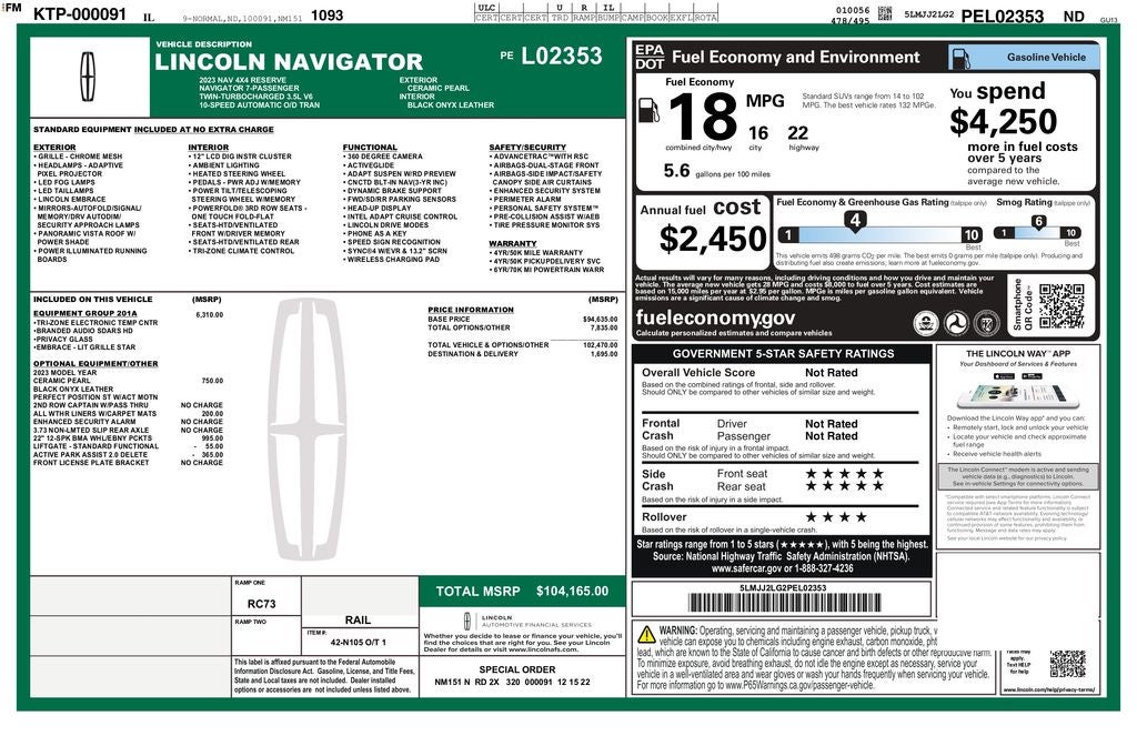 Equipment Group 201A Reserve I, Luxury Package (Illuminated 1st & 2nd Row Seat Belts, Lincoln Lit Star in Grille, Perfect Position Seats (30-Way) w/Active Motion, and Radio: Revel Ultima 3D Audio System w/28 Speakers), 4WD, Black Onyx Leather, 14 Speakers, 3.73 Axle Ratio, 3rd row seats: split-bench, 4-Wheel Disc Brakes, ABS brakes, Active Park Assist 2.0 Delete, Adaptive suspension, Adjustable pedals, Air Conditioning, All-Weather Floor Liners w/Carpet Floor Mats, Alloy wheels, AM/FM radio: SiriusXM with 360L, Audio memory, Auto High-beam Headlights, Auto Start-Stop Technology, Auto tilt-away steering wheel, Auto-dimming door mirrors, Auto-dimming Rear-View mirror, Auto-leveling suspension, Automatic temperature control, Bodyside moldings, Brake assist, Bumpers: body-color, Compass, Cruise Control / Speed control, Delay-off headlights, Driver door bin, Driver vanity mirror, Driver's Seat Mounted Armrest, Dual front impact airbags, Dual front side impact airbags, Electronic Stability Control, Emergency communication system: 911 Assist, Exterior Parking Camera Rear, Four wheel independent suspension, Front anti-roll bar, Front Bucket Seats, Front dual zone A/C, Front fog lights, Front License Plate Bracket, Front reading lights, Fully automatic headlights, Garage door transmitter, Genuine wood dashboard insert, Genuine wood door panel insert, Hands-Free Liftgate Delete, Head restraints memory, Heads-Up Display, Heated door mirrors, Heated front seats, Heated rear seats, Heated steering wheel, HVAC memory, Illuminated entry, Leather steering wheel, Low tire pressure warning, Memory seat, Navigation system: Connected Navigation (3-year trial), Occupant sensing airbag, Outside temperature display, Overhead airbag, Overhead console, Panic alarm, Passenger door bin, Passenger seat mounted armrest, Passenger vanity mirror, Pedal memory, Power adjustable rear head restraints, Power door mirrors, Power driver seat, Power Liftgate, Power moonroof: Panoramic Vista Roof, Power passenger seat, Power steering, Power windows, Prem Lthr Auto Htd/Ventiltd Perfect Position Seats, Radio data system, Radio: Revel AM/FM/HD/MP3 Audio System, Rain sensing wipers, Rear air conditioning, Rear anti-roll bar, Rear audio controls, Rear reading lights, Rear window defroster, Rear window wiper, Reclining 3rd row seat, Remote keyless entry, Security System, SiriusXM w/360L, Speed-sensing steering, Speed-Sensitive Wipers, Split folding rear seat, Spoiler, Steering wheel memory, Steering wheel mounted audio controls, SYNC 4 Communications & Entertainment System, Tachometer, Telescoping steering wheel, Tilt steering wheel, Traction control, Trip computer, Turn signal indicator mirrors, Variably intermittent wipers, Ventilated front seats, Ventilated rear seats, Voice-Activated Touchscreen Navigation System, Wheels: 22 12-Spoke Bright-Machined Aluminum, and Wheels: 22 Bright Machined Aluminum