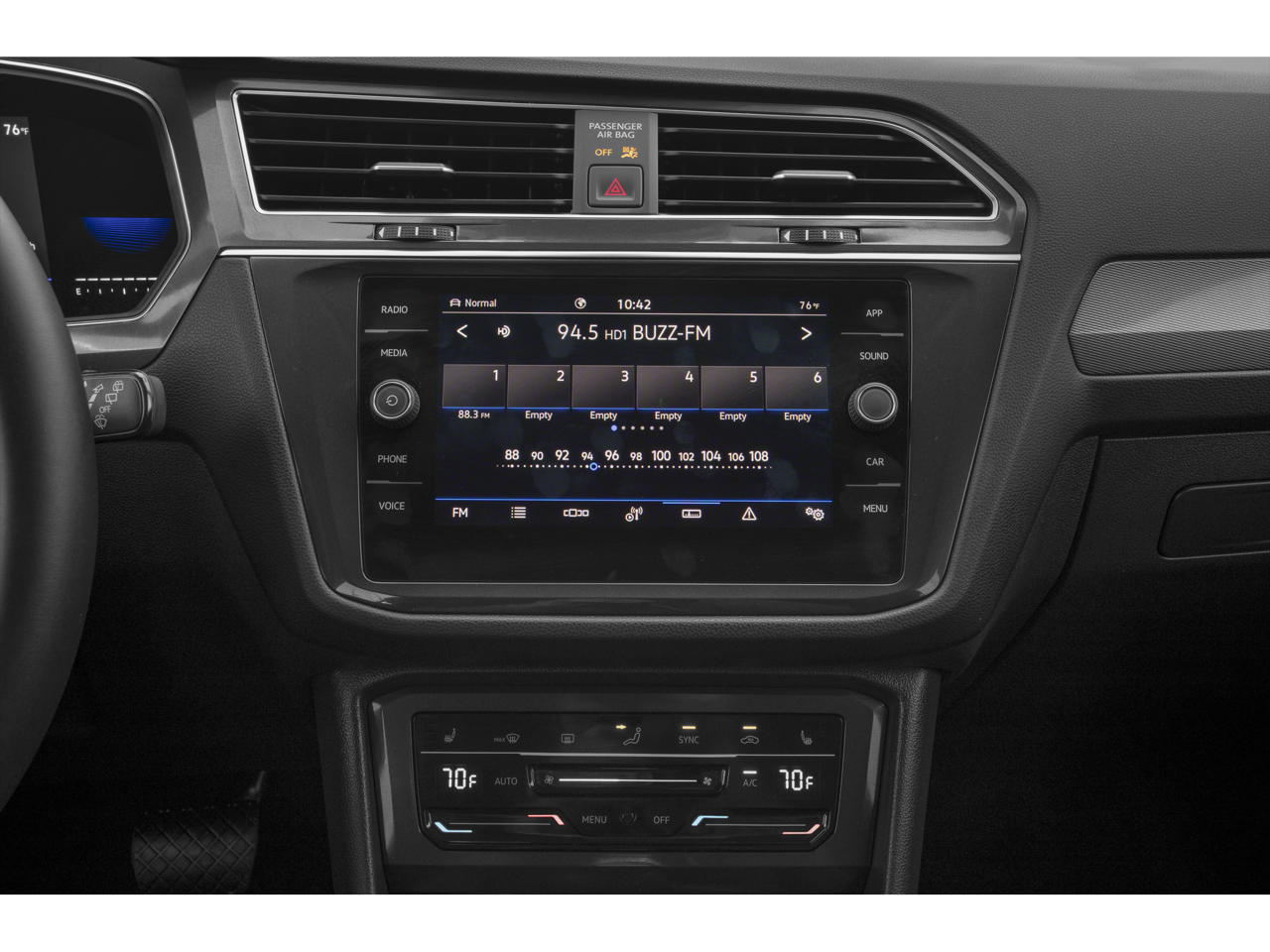 - Radio: MIB3 Composition Media AM/FM/HD -inc: 8" touchscreen, WMA/MP3/FLAC player w/USB-C, voice control, 6-speaker sound system, capability for in-vehicle 4G LTE enabled Wi-Fi (cellular data plan required; includes limited trial), capability for VW Car-Net services (capabilities for certain services vary; requires enrollment or subscription), Bluetooth connectivity (for compatible devices), SiriusXM w/360L (w/3-month free trial subscription; 360L services require acceptance of Car-Net terms), App-Connect smartphone integration (w/Apple CarPlay, Android Auto and MirrorLink) via USB, Wireless App-Connect smartphone integration (for compatible devices) w/multi-phone pairing capability, 45W fast charging (for compatible mobile phones and accessories) via USB in first and second rows and Qi wireless inductive charger (for compatible mobile phones and accessories)