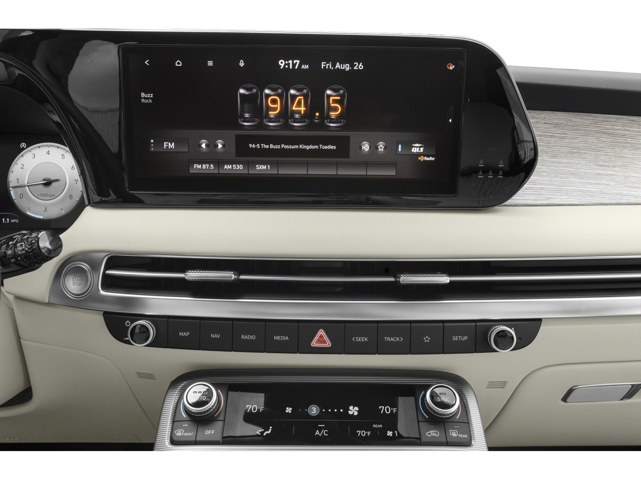 - Radio: AM/FM/MP3 Audio System -inc: 12.3" color touchscreen display, onboard navigation w/traffic flow including incident data via HD Radio (HERE), Over-the-Air (OTA) map updates, SiriusXM, USB, Android Auto and Apple CarPlay, rear seat quiet mode, Bluetooth hands-free connectivity w/multiple device connection and wireless audio streaming, Wifi hotspot, dynamic voice recognition and Bluelink Connected Car System